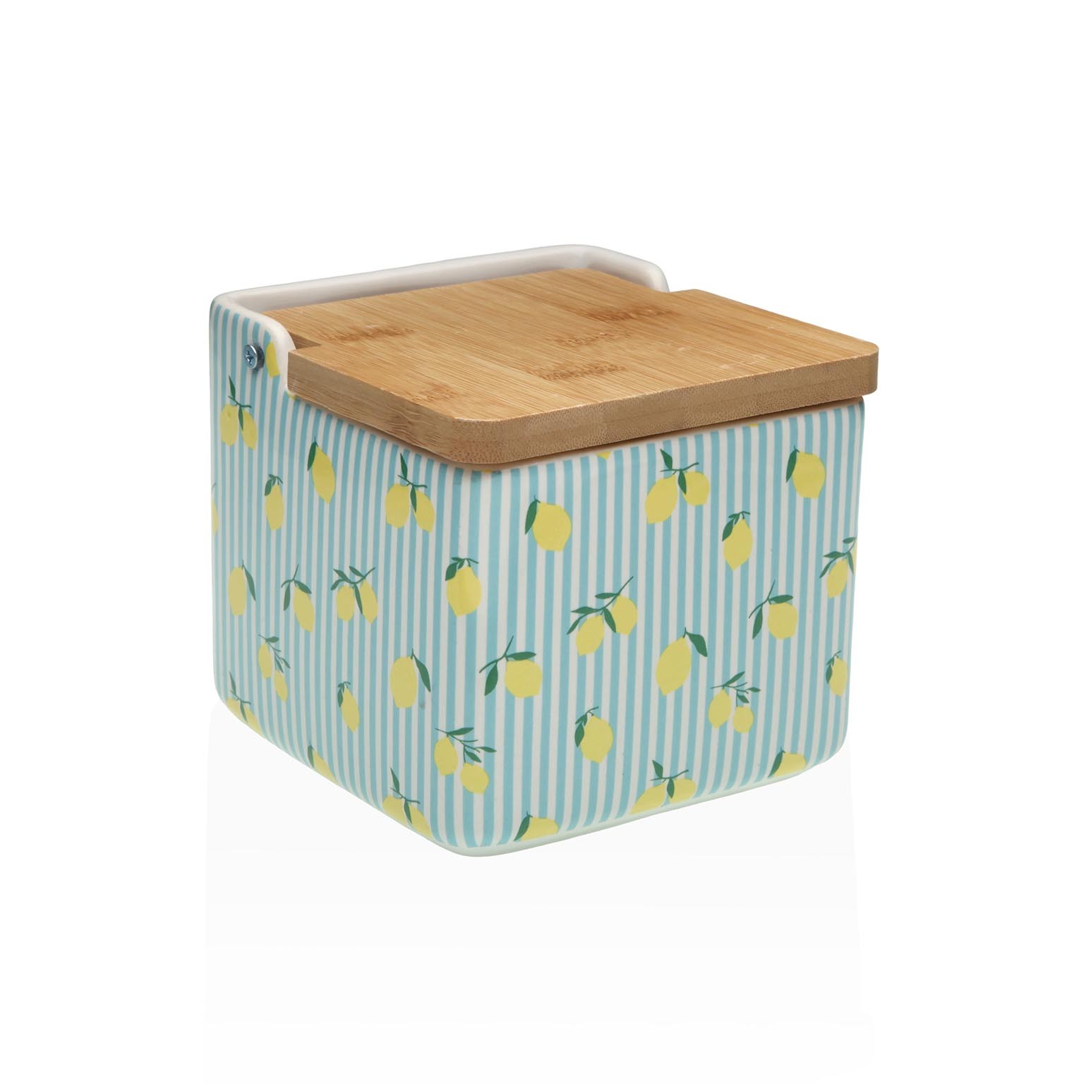 Con dimensioni di 11,5 cm in altezza e 12,2 cm in larghezza e lunghezza, presenta un affascinante motivo di limoni su uno sfondo bianco, arricchito da strisce blu.