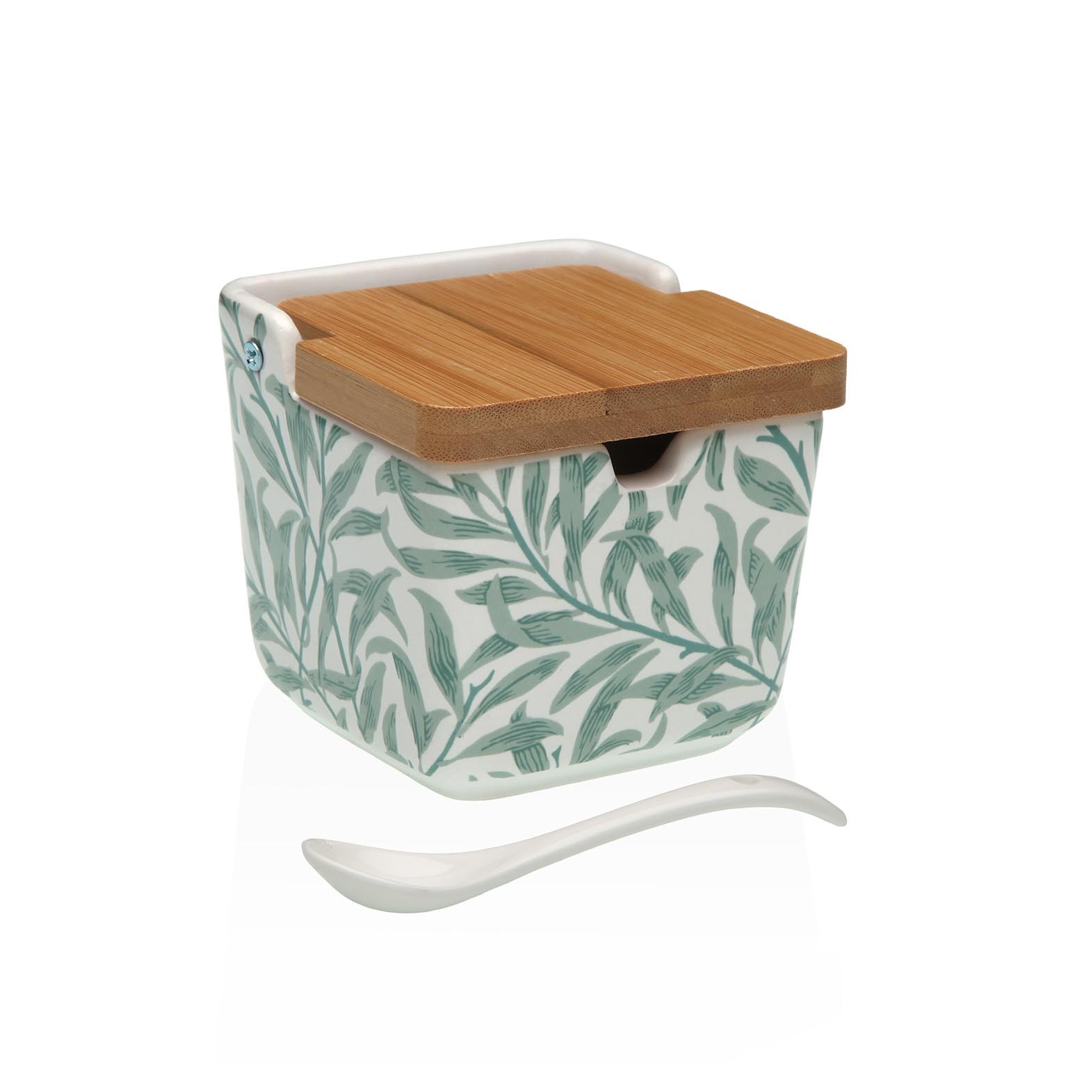 La zuccheriera Azucarero Folia è un elegante accessorio da cucina in ceramica, caratterizzato da un design moderno e decorazioni verdi che richiamano la natura.