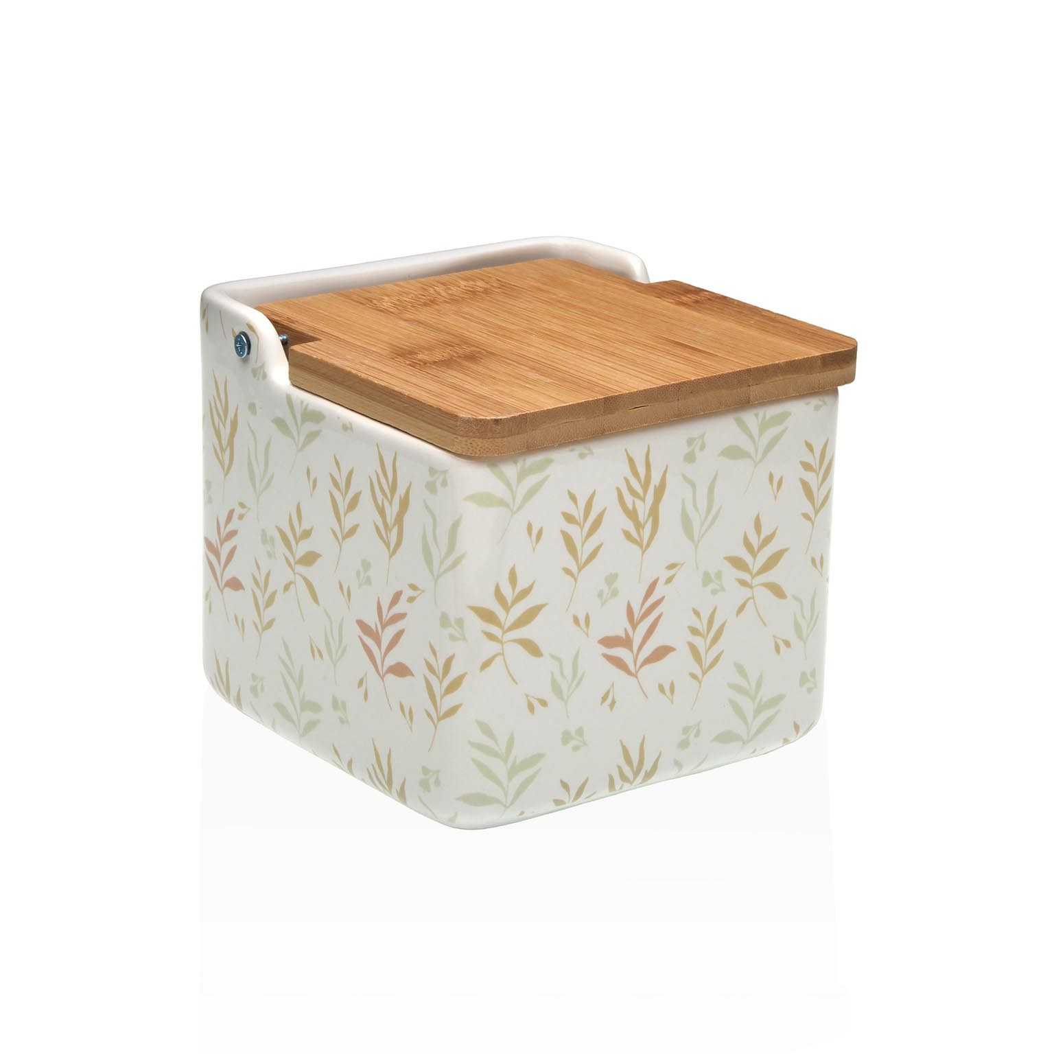 La saliera Bruma è un accessorio da cucina elegante e funzionale, realizzata in ceramica con un coperchio in legno, probabilmente bamboo.
