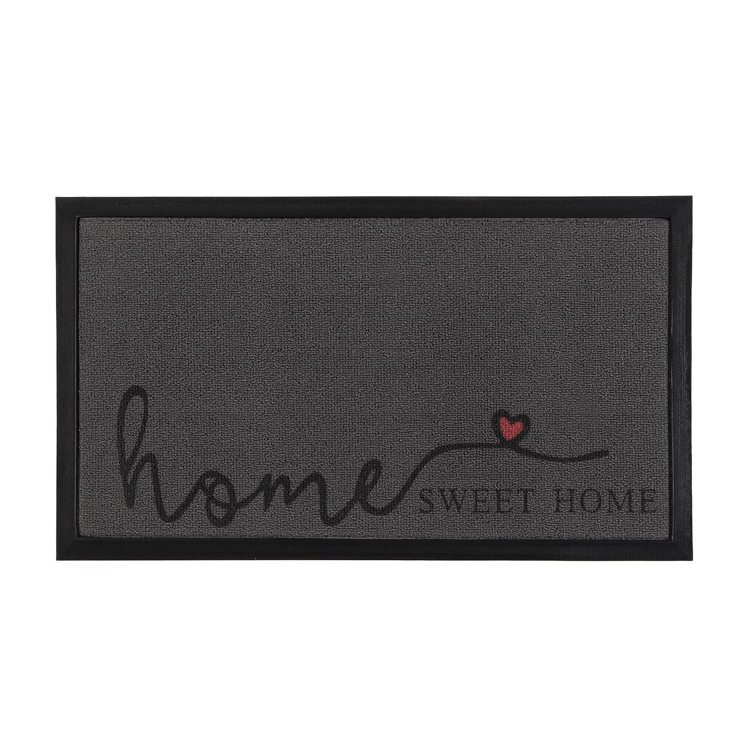 Realizzato in poliestere e TPE, questo zerbino presenta un design moderno con uno sfondo grigio scuro, bordi neri e un tocco di rosso nel cuore, accompagnato da un testo bianco.