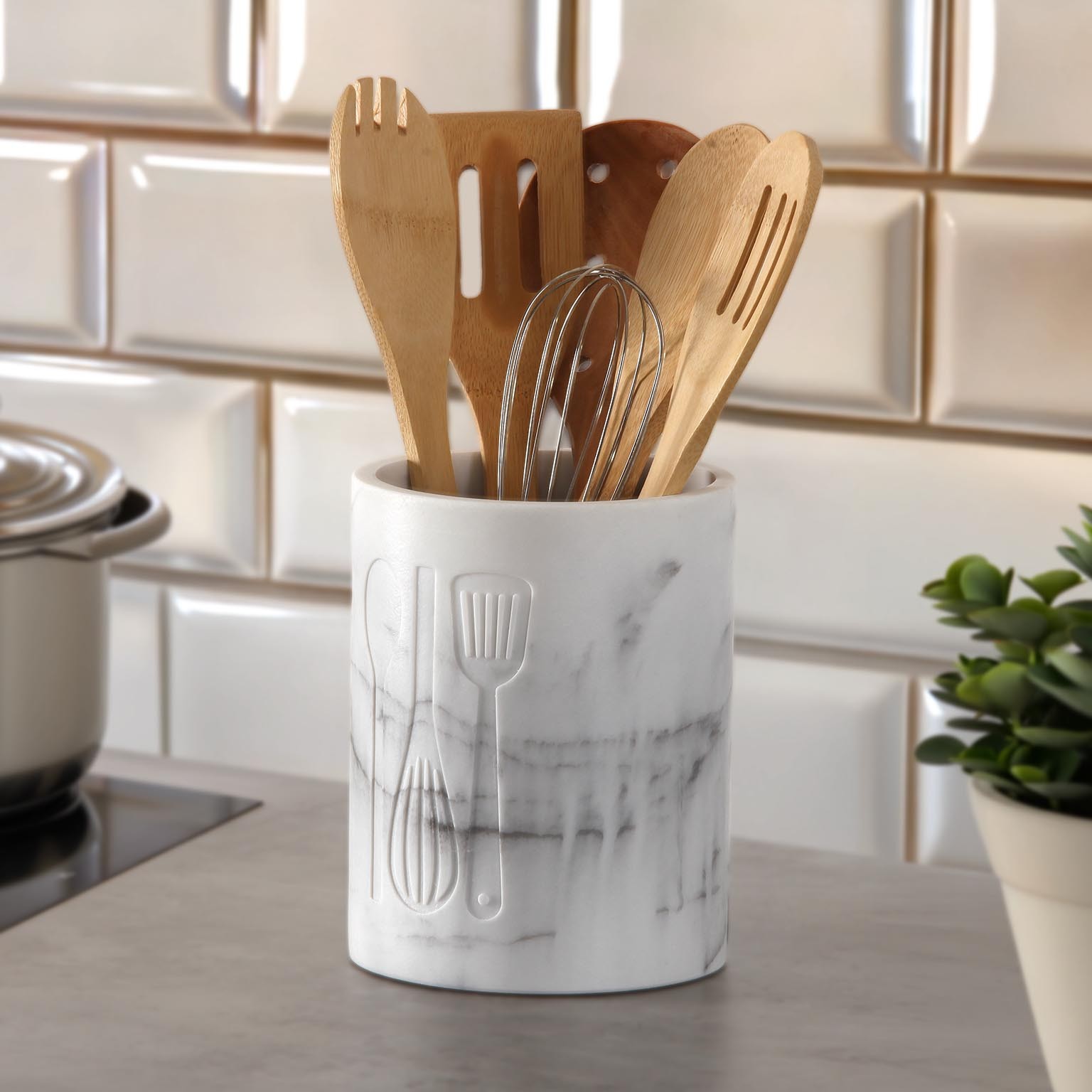 Con dimensioni di 17,5 cm di altezza, 10,2 cm di larghezza e 11,5 cm di lunghezza, è progettato per organizzare utensili da cucina come spatole e cucchiai.