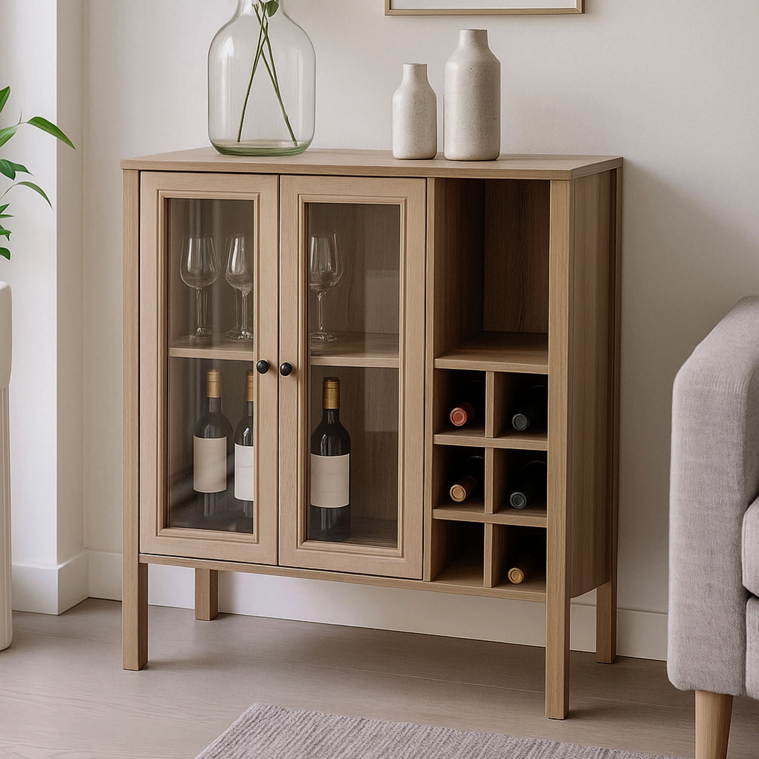 Realizzata con una struttura in legno MDF e pino, presenta ante in cristallo che permettono di esporre bottiglie e oggetti decorativi.