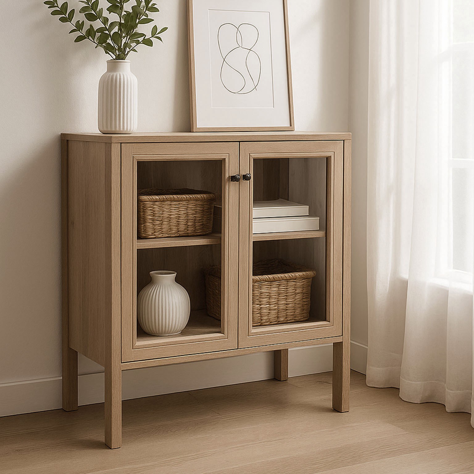 La tonalità di legno chiaro e il vetro trasparente conferiscono luminosità e leggerezza agli ambienti, integrandosi armoniosamente con altri mobili e complementi d'arredo.