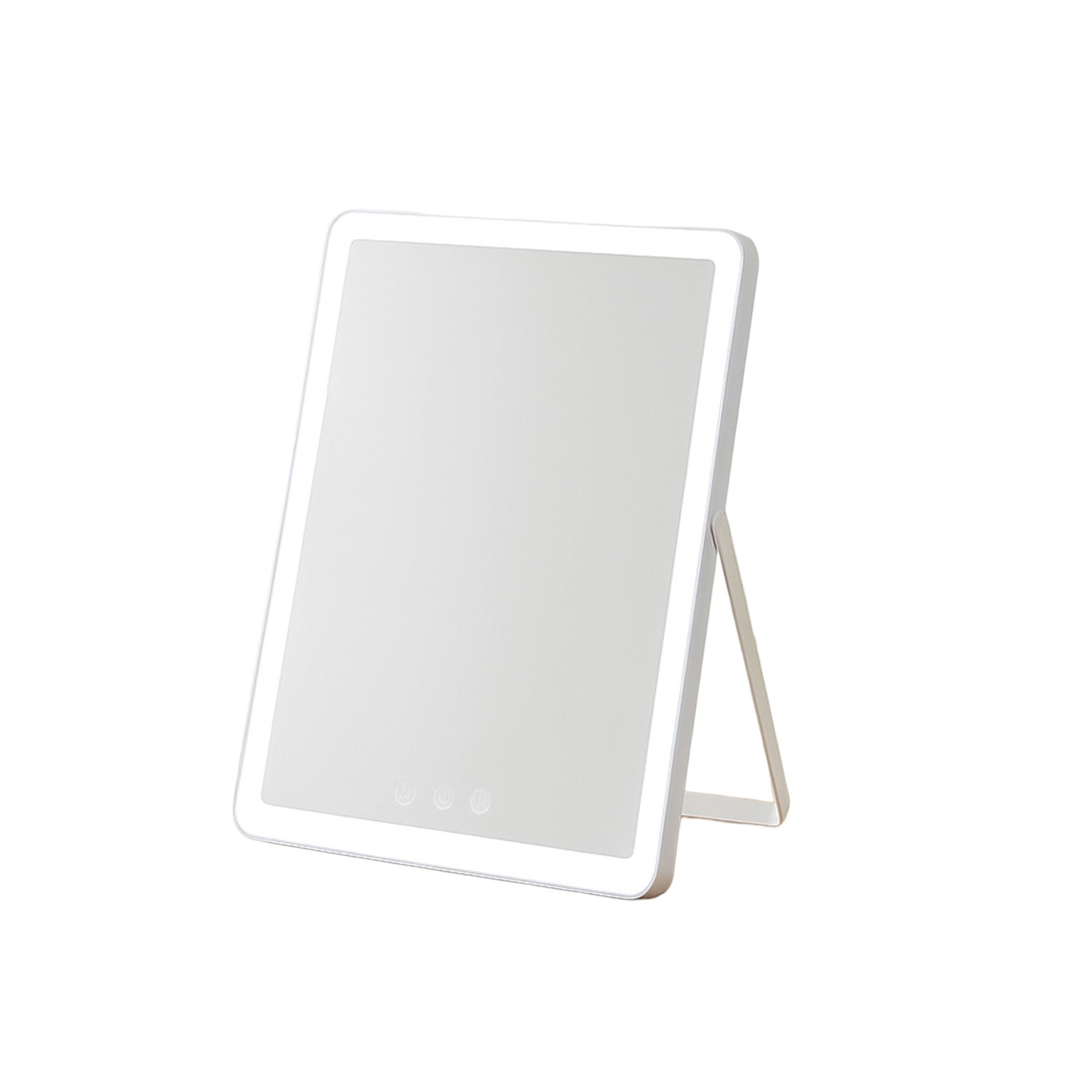 Specchio rettangolare con illuminazione a LED integrata e supporto, ideale per ambienti moderni.
